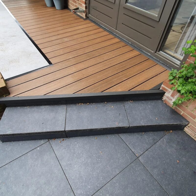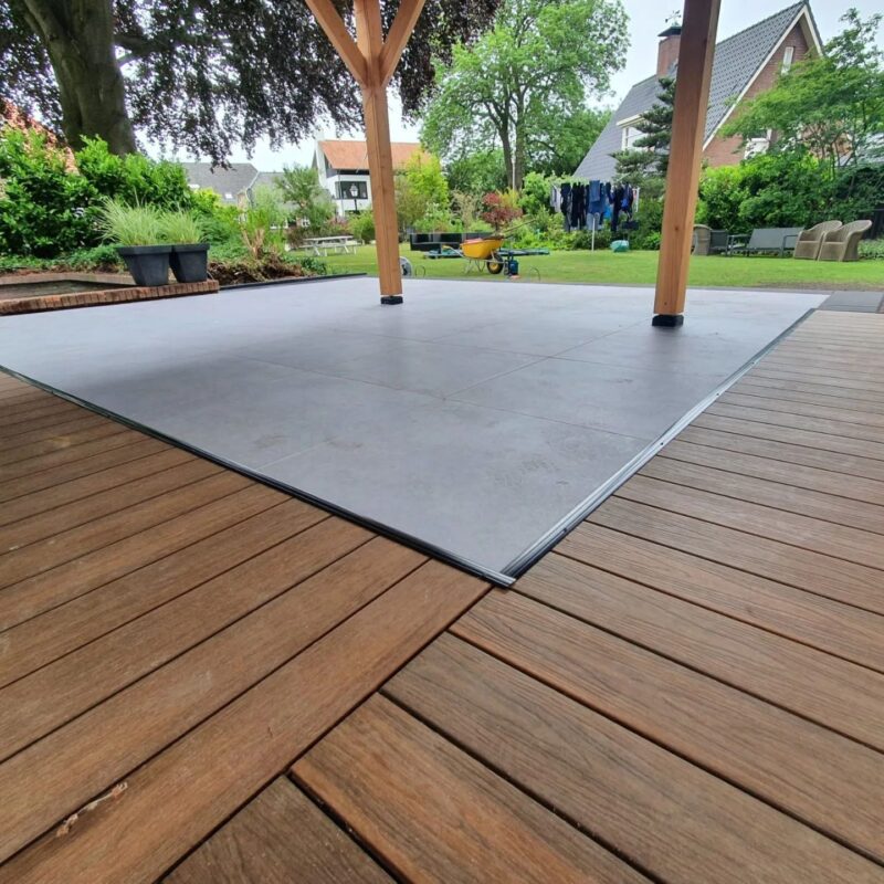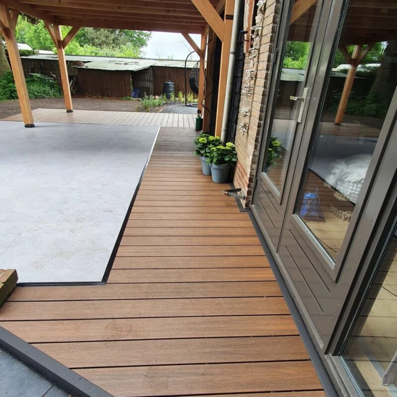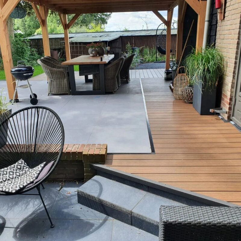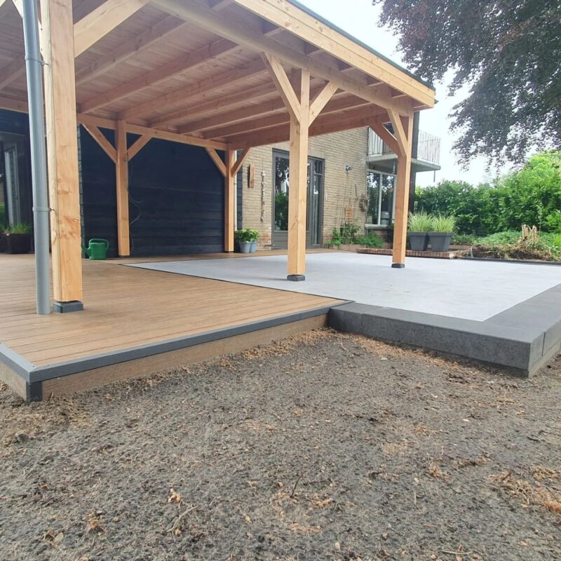 Onder de overkapping hebben wij een verhoogd terras aangelegd met grote keramische tegels. Naast het terras hebben we een vlonder aangelegd bestaande uit composiet planken op een frame van hardhout. De zijkanten zijn mooi afgewerkt met sierstrips.