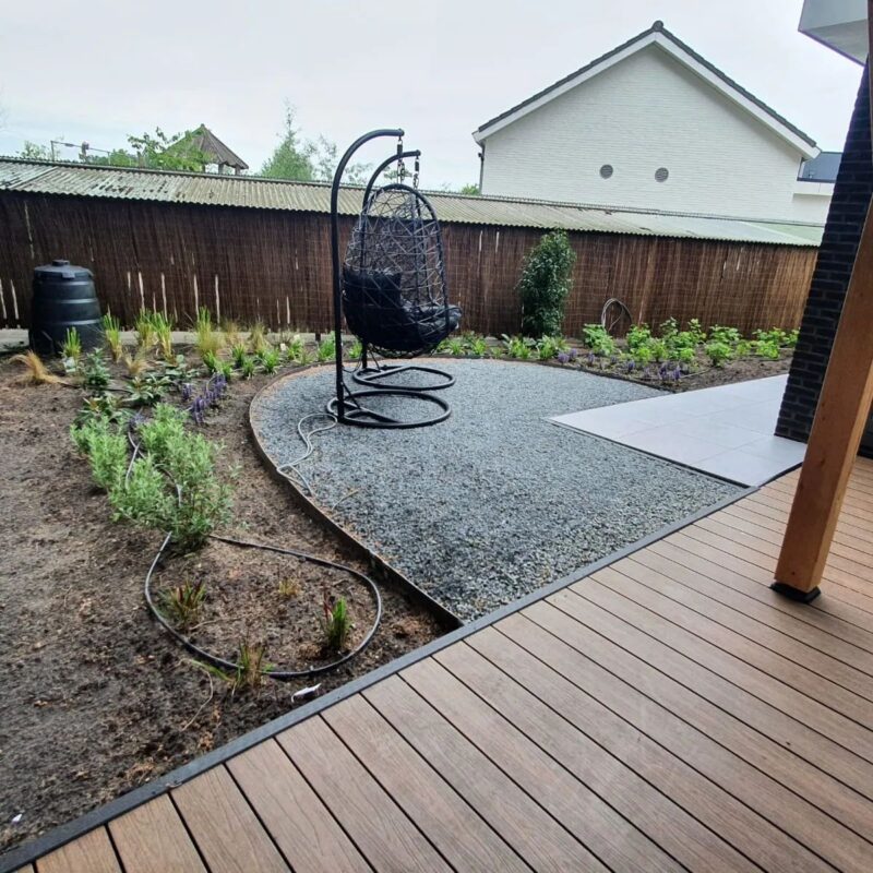 Dan was er nog een plekje waar je heerlijk van de avondzon kan genieten in deze tuin. Hier hebben wij een Cortonstalen rand geplaats met daarin kunstof grindplaten gevuld met split. Hierdoor kun je goed op dit split staan of zitten. Zie de foto’s voor mooie resultaten!
