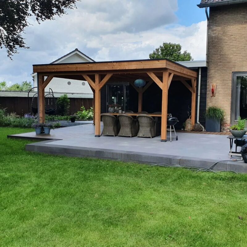 We hebben een grote douglas overkapping geplaatst. Deze hebben we waterdicht aan de woning gemonteerd. De oude planken aan de woning hebben we vervangen door zwarte douglas planken.